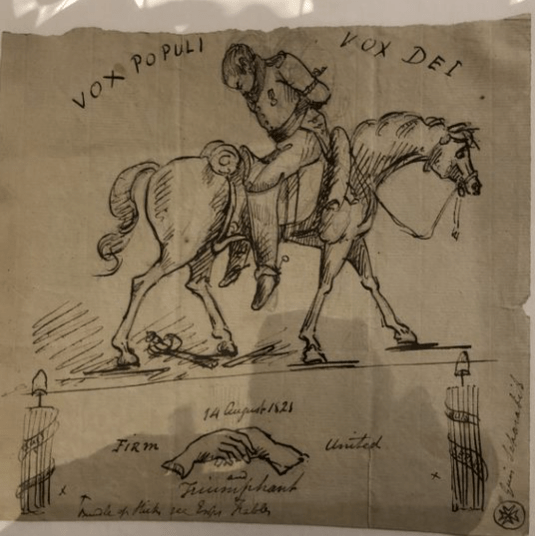 Figure 1. George Cruikshank, Vox Populi, Vox Dei. Unpublished design for a caricature on the violence at Queen Caroline’s funeral. Berg Collection, New York Public Library. Author’s photograph.