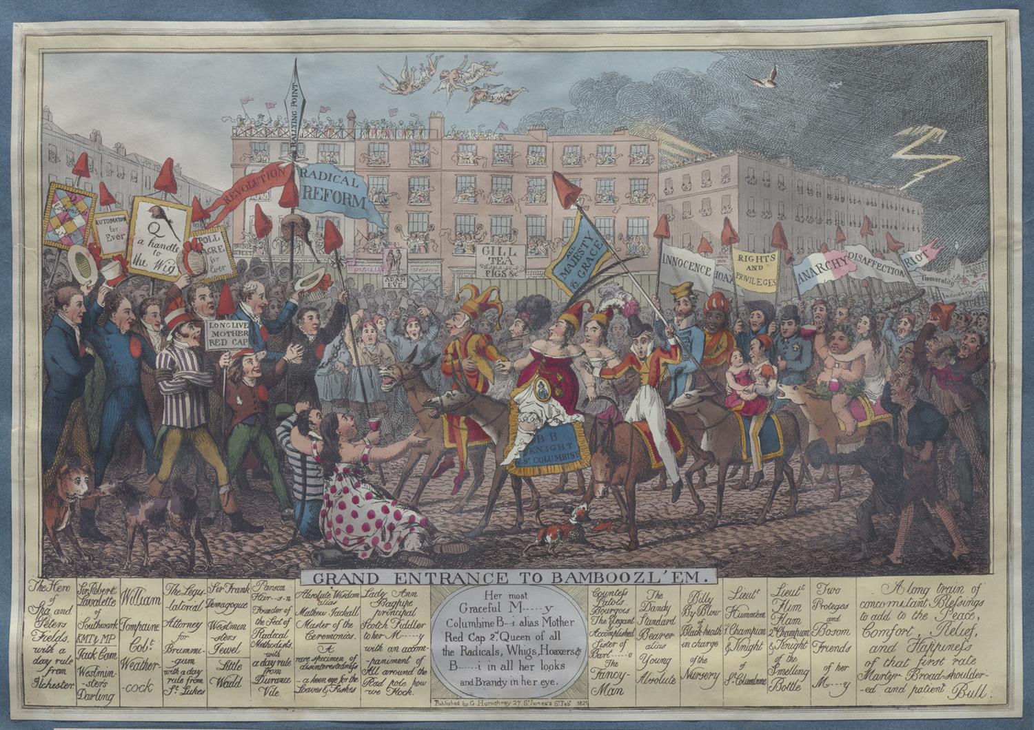 These identities are no doubt intended to confirm Caroline’s ‘trollop’ misdemeanours and unforgiveable mingling with the hoi polloi, but they also evoke a rumbustious culture of popular performance and folk tradition which gives the print an engaging, populist and carnivalesque quality. The uplifting impression created by the vivid colours, festive atmosphere, multiculturalism (Caroline’s entourage includes a black man who could be her adopted servant Louges)[9] and conviviality (Bacchus is literally part of the crew), together with the transformation of central London into an amphitheatre of democratic spectacle, overpowers the negativity of the incendiary banners which recede into the right distance, and the ominous bolt of lightning on the horizon. The lively gaggle of reformers who are waiting to greet Caroline (including the Peterloo speaker Henry Hunt, who was still in jail) are not heavily caricatured. The lavish detail of the print, which contains dozens of well-drawn characters and many symbols, is also a tribute to the quality and efficacy of the Carolinite caricature campaign which had set such a high bar. This may be a vaudeville Caroline, but the effervescent and joyous emotion of the scene has an infectious and seductive energy.