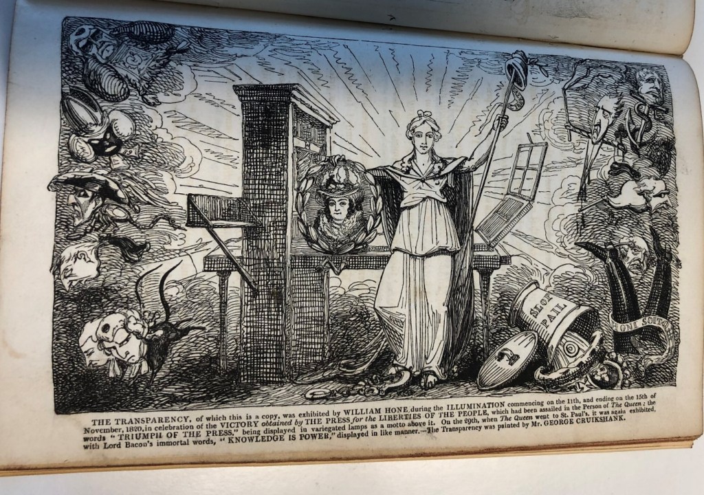 Figure 9. George Cruikshank, engraving of a transparency of Queen Caroline, included in William Hone’s The Political Showman – At Home! (1821). Wilhelm Busch Museum. Author’s photograph.