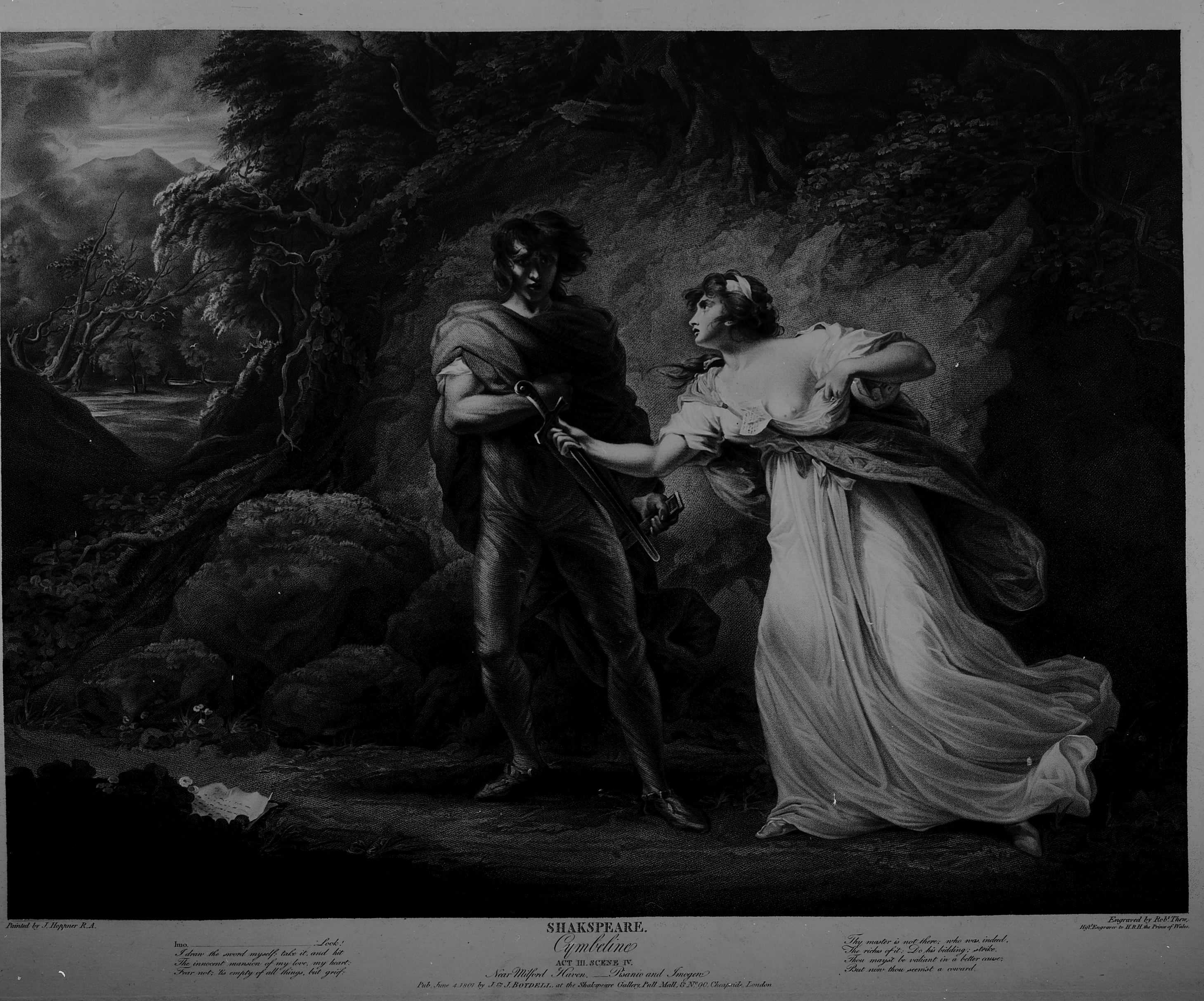Imo. Look! / I draw the sword myself: take it, and hit / The innocent mansion of my love, my heart: / Fear not; ’tis empty of all things, but grief: / Thy master is not there; who was, indeed, / The riches of it: Do his bidding; strike. / Thou may’st be valiant in a better cause; / But now thou seem’st a coward.