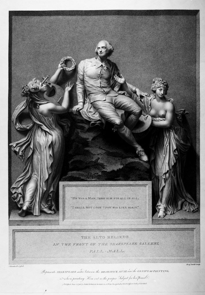 Represents SHAKSPEARE seated between the DRAMATIC MUSE and the GENIUS OF PAINTING, who is pointing Him out as the proper Subject for her Pencil.