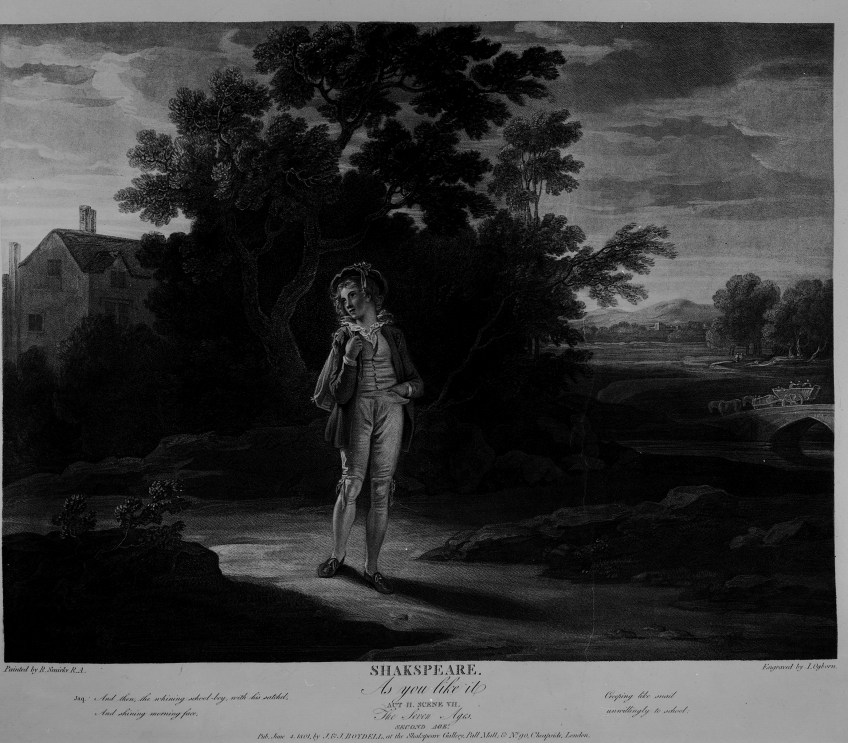 As You Like It – Act II, Scene VII Published June 3, 2015 at 2760 × 2420 in Shakespeare Gallery Act II, Scene VII (b) Painted by R. Smirke R.A. Engraved by I. Ogborn ‘The Seven Ages. Second Age.’ Jaq. And then, the whining school-boy, with his satchel, / And shining morning face, / Creeping like snail unwillingly to school: Like Loading...