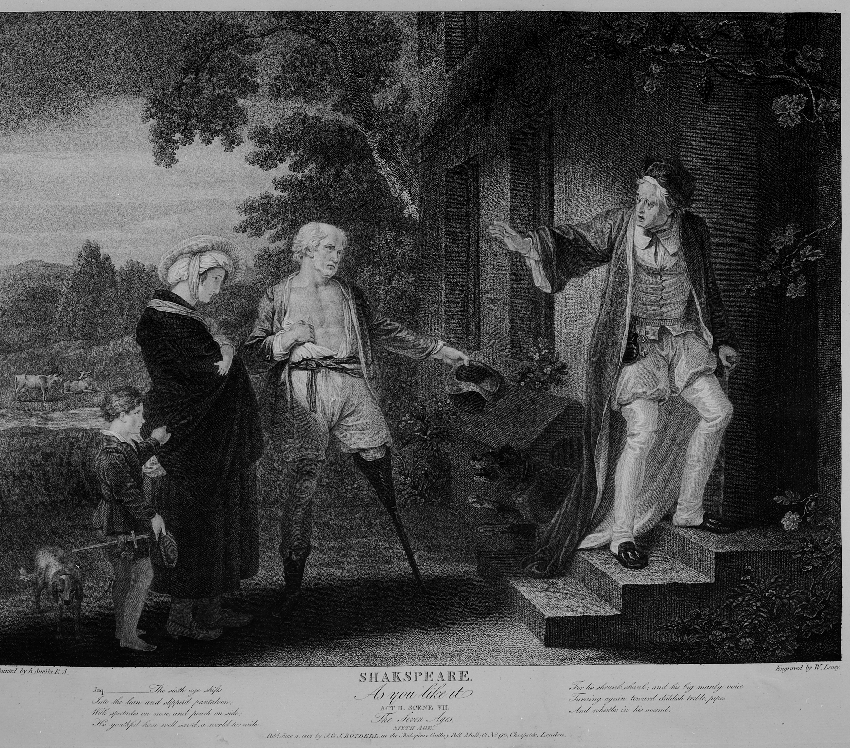 Jaq. The sixth age shifts / Into the lean and slipper’d pantaloon; / With spectacles on nose and pouch on side; / His youthful hose well sav’d, a world too wide / For his shrunk shank; and his big manly voice / Turning again toward childish treble, pipes / And whistles in his sound: