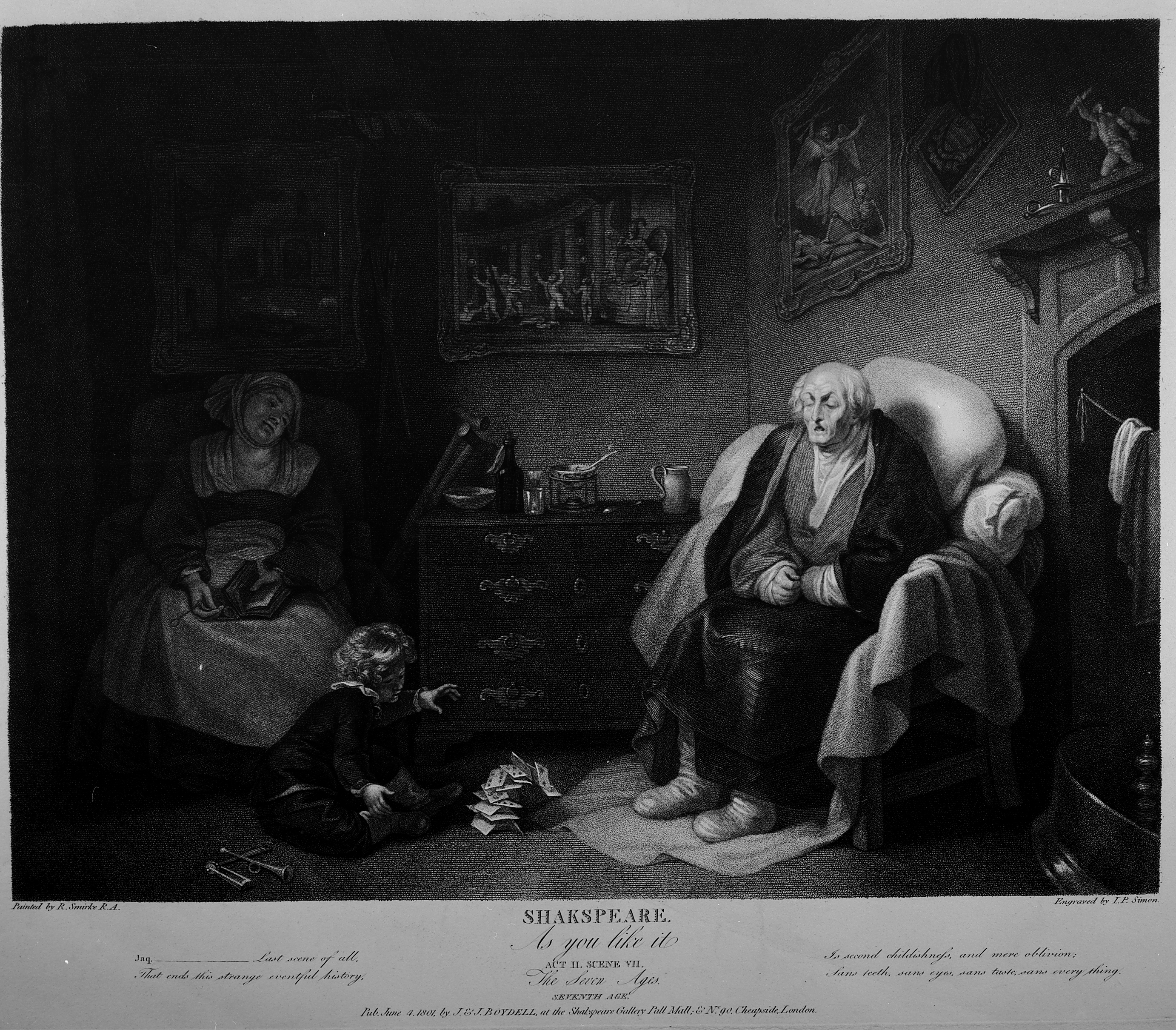 Jaq. Last scene of all. / That ends this strange eventful history, / Is second childishness, and mere oblivion; / Sans teeth, sans eyes, sans taste, sans every thing.