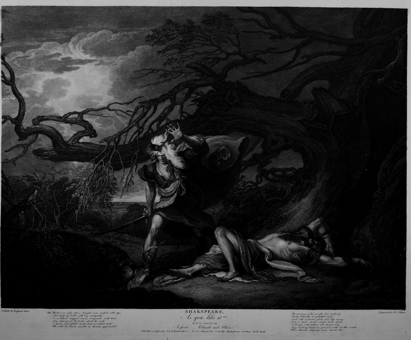 Oli. Under an oak, whose boughs were moss’d with age, / And high top bald with dry antiquity, / A wretched ragged man, o’ergrown with hair, / Lay sleeping on his back: about his neck / A green and gilded snake had wreath’d itself. / Who with her head, nimble in threats, approach’d / The opening of his mouth; but suddenly / Seeing Orlando, it unlink’d itself. / And with indented glides did slip away / Into a bush: under which bush’s shade / A lioness, with udders all drawn dry, / Lay couching, head on ground, with cat like watch, / When that the sleeping man should stir.