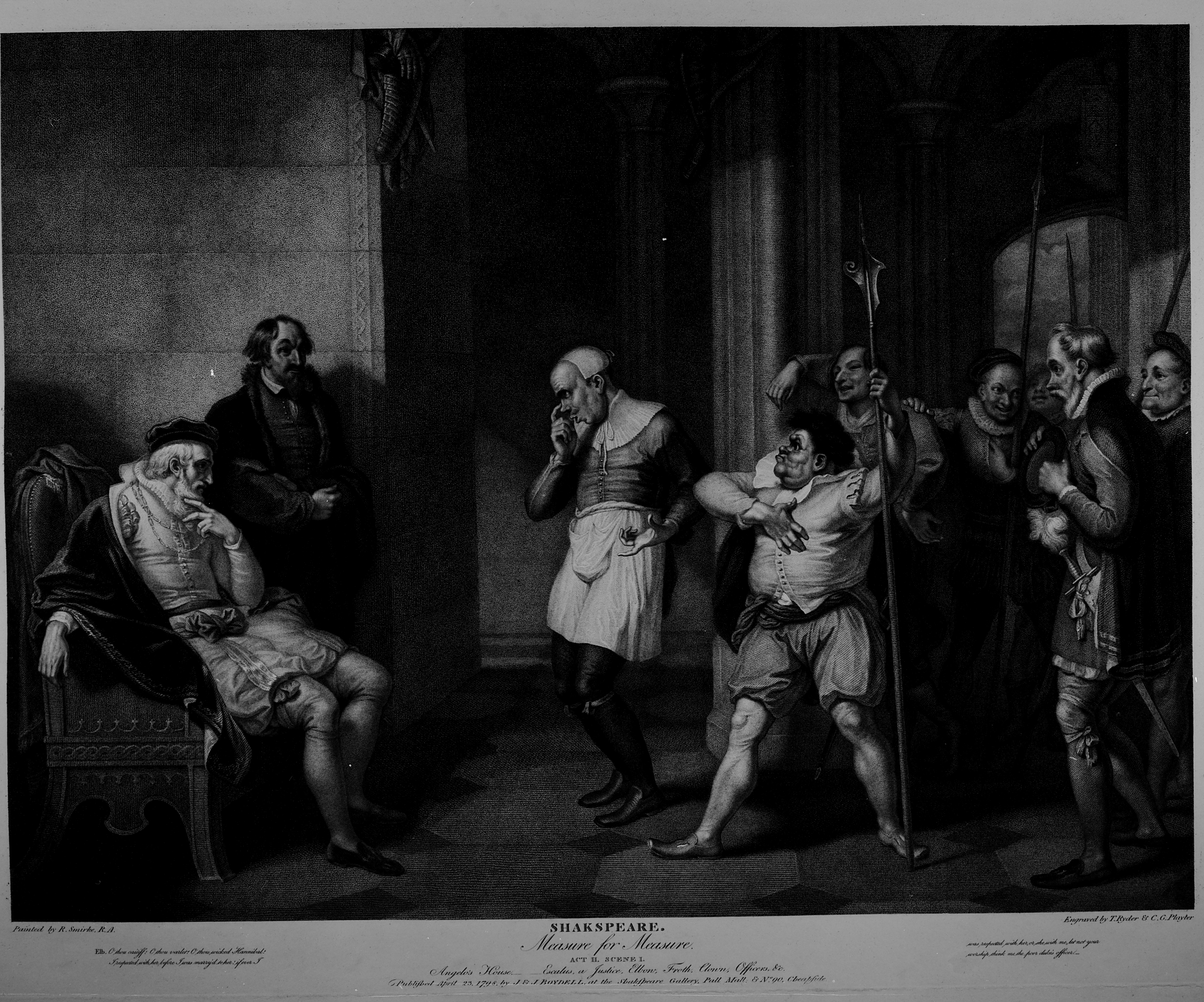 ‘Angelo’s House. Escalus, a Justice, Elbow, Froth, Clown, Offices, &c.’